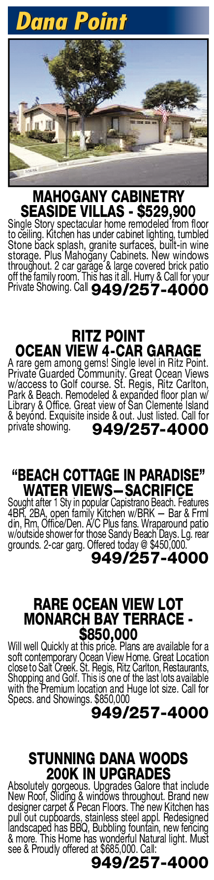 MAHOGANY CABINETRY SEASIDE VILLAS - $529,900 Single Story spectacular home remodeled from floor to ceiling. Kitchen has under cabinet lighting, tumbled Stone back splash, granite surfaces, built-in wine storage. Plus Mahogany Cabinets. New windows throughout. 2 car garage & large covered brick patio off the family room. This has it all. Hurry & Call for your Private Showing. Call 949/257-4000