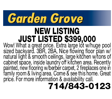 NEW LISTING JUST LISTED $399,000 Wow! What a great price. Extra large lot w/huge pool sized backyard. 3BR, 2BA, Nice flowing floor plan w/ natural light & smooth ceilings, large kitchen w/tons of cabinet space, inside laundry off kitchen area. Recently painted, new flooring w/berber carpet, 2 fireplaces one in family room & living area. Come & see this home. Great price. For more information & availability call.