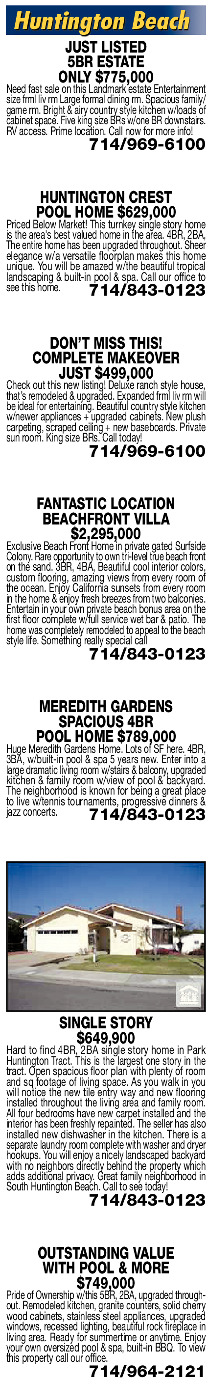HUNTINGTON CREST POOL HOME $629,000 Priced Below Market! This turnkey single story home is the area's best valued home in the area. 4BR, 2BA, The entire home has been upgraded throughout. Sheer elegance w/a versatile floorplan makes this home unique. You will be amazed w/the beautiful tropical landscaping & built-in pool & spa. Call our office to see this home. 714/843-0123