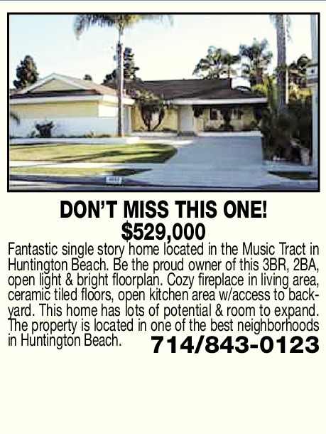 $529,000 Fantastic single story home located in the Music Tract in Huntington Beach. Be the proud owner of this 3BR, 2BA, open light & bright floorplan. Cozy fireplace in living area, ceramic tiled floors, open kitchen area w/access to backyard. This home has lots of potential & room to expand.