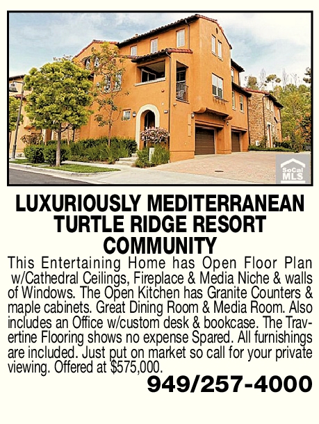 LUXURIOUSLY MEDITERRANEAN TURTLE RIDGE RESORT COMMUNITY This Entertaining Home has Open Floor Plan w/Cathedral Ceilings, Fireplace & Media Niche & walls of Windows. The Open Kitchen has Granite Counters & maple cabinets. Great Dining Room & Media Room. Also includes an Office w/custom desk & bookcase. The Travertine Flooring shows no expense Spared. All furnishings are included. Just put on market so call for your private viewing. Offered at $575,000. 949/257-4000