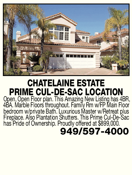 CHATELAINE ESTATE PRIME CUL-DE-SAC LOCATION Open, Open Floor plan. This Amazing New Listing has 4BR, 4BA. Marble Floors throughout. Family Rm w/FP Main Floor bedroom w/private Bath. Luxurious Master w/Retreat plus Fireplace. Also Plantation Shutters. This Prime Cul-De-Sac has Pride of Ownership. Proudly offered at $899,000. 949/597-4000