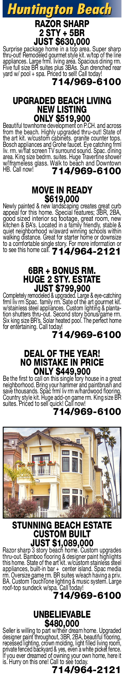 UPGRADED BEACH LIVING NEW LISTING ONLY $519,900 Beautiful townhome development on P.CH. and across from the beach. Highly upgraded thru-out! State of the art kit. w/custom cabinets. granite counter tops. Bosch appliances and Grohe faucet. Eye catching frml liv. rm. w/flat screen TV surround sound. Spac. dining area. King size bedrm. suites. Huge Travertine shower w/lframeless glass. Walk to beach and Downtown HB. Call now! 714/969-6100