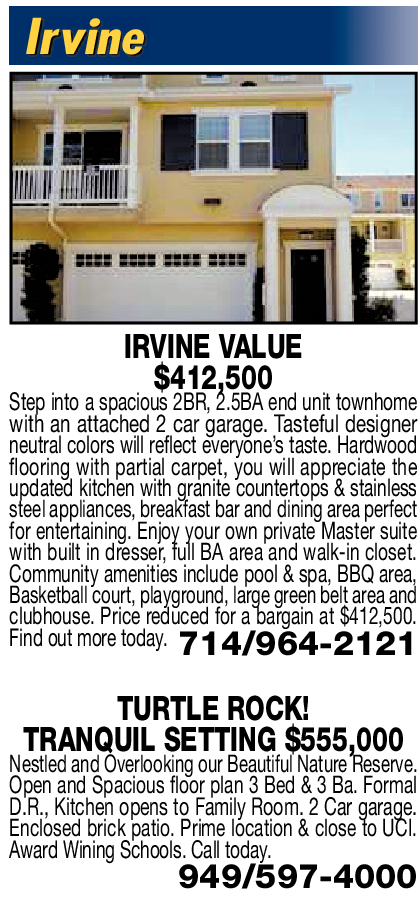 Irvine IRVINE VALUE $412,500 Step into a spacious 2BR, 2.5BA end unit townhome with an attached 2 car garage. Tasteful designer neutral colors will reflect everyone’s taste. Hardwood flooring with partial carpet, you will appreciate the updated kitchen with granite countertops & stainless steel appliances, breakfast bar and dining area perfect for entertaining. Enjoy your own private Master suite with built in dresser, full BA area and walk-in closet. Community amenities include pool & spa, BBQ area, Basketball court, playground, large green belt area and clubhouse. Price reduced for a bargain at $412,500. Find out more today. 714/964-2121 TURTLE ROCK! TRANQUIL SETTING $555,000 Nestled and Overlooking our Beautiful Nature Reserve. Open and Spacious floor plan 3 Bed & 3 Ba. Formal D.R., Kitchen opens to Family Room. 2 Car garage. Enclosed brick patio. Prime location & close to UCI. Award Wining Schools. Call today. 949/597-4000