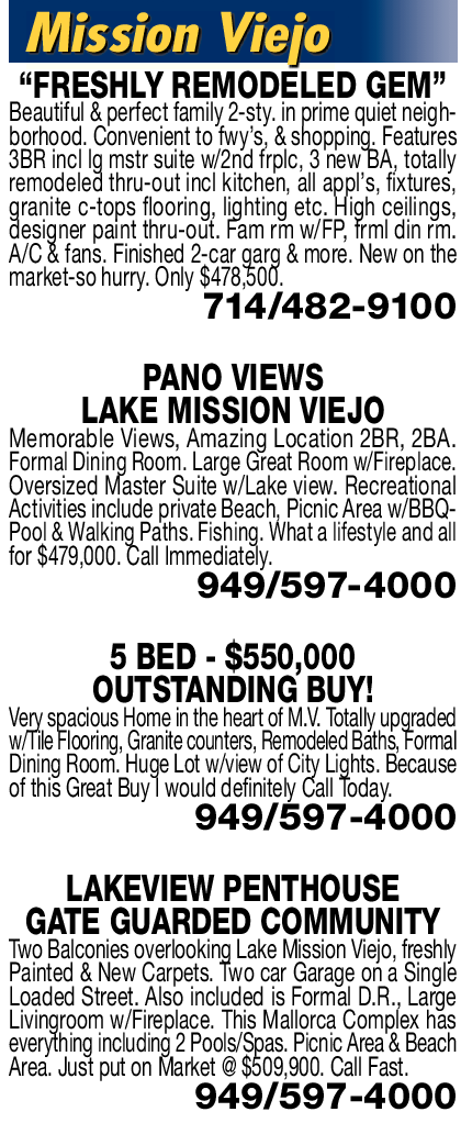 LAKEVIEW PENTHOUSE GATE GUARDED COMMUNITY Two Balconies overlooking Lake Mission Viejo, freshly Painted & New Carpets. Two car Garage on a Single Loaded Street. Also included is Formal D.R., Large Livingroom w/Fireplace. This Mallorca Complex has everything including 2 Pools/Spas. Picnic Area & Beach Area. Just put on Market @ $509,900. Call Fast.