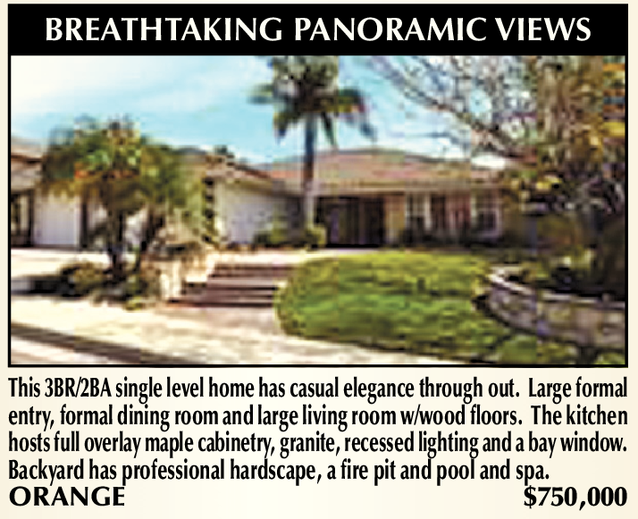 This 3BR/2BA single level home has casual elegance through out. Large formal entry, formal dining room and large living room w/wood floors. The kitchen hosts full overlay maple cabinetry, granite, recessed lighting and a bay window. Backyard has professional hardscape, a fire pit and pool and spa. ORANGE $750,000