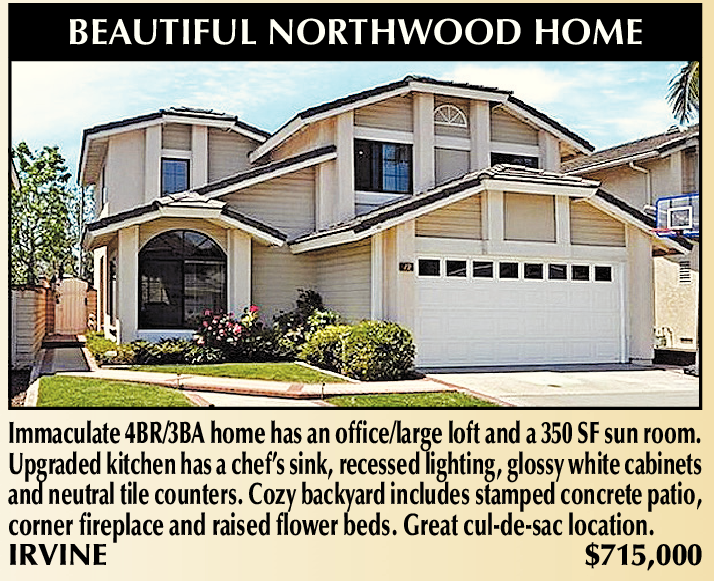 Immaculate 4BR/3BA home has an office/large loft and a 350 SF sun room. Upgraded kitchen has a chef’s sink, recessed lighting, glossy white cabinets and neutral tile counters. Cozy backyard includes stamped concrete patio, corner fireplace and raised flower beds. Great cul-de-sac location. IRVINE $715,000