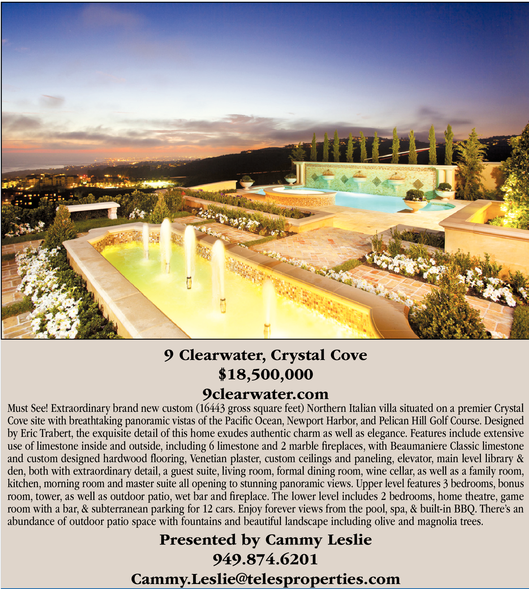 9 Clearwater, Crystal Cove $18,500,000 9clearwater.com Must See! Extraordinary brand new custom (16443 gross square feet) Northern Italian villa situated on a premier Crystal Cove site with breathtaking panoramic vistas of the Pacific Ocean, Newport Harbor, and Pelican Hill Golf Course. Designed by Eric Trabert, the exquisite detail of this home exudes authentic charm as well as elegance. Features include extensive use of limestone inside and outside, including 6 limestone and 2 marble fireplaces, with Beaumaniere Classic limestone and custom designed hardwood flooring, Venetian plaster, custom ceilings and paneling, elevator, main level library & den, both with extraordinary detail, a guest suite, living room, formal dining room, wine cellar, as well as a family room, kitchen, morning room and master suite all opening to stunning panoramic views. Upper level features 3 bedrooms, bonus room, tower, as well as outdoor patio, wet bar and fireplace. The lower level includes 2 bedrooms, home theatre, game room with a bar, & subterranean parking for 12 cars. Enjoy forever views from the pool, spa, & built-in BBQ. There’s an abundance of outdoor patio space with fountains and beautiful landscape including olive and magnolia trees. Presented by Cammy Leslie 949.874.6201 Cammy.Leslie@telesproperties.com