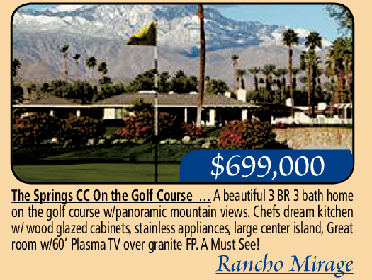 $699,000 The Springs CC On the Golf Course … A beautiful 3 BR 3 bath home on the golf course w/panoramic mountain views. Chefs dream kitchen w/ wood glazed cabinets, stainless appliances, large center island, Great room w/60’ Plasma TV over granite FP. A Must See! Rancho Mirage