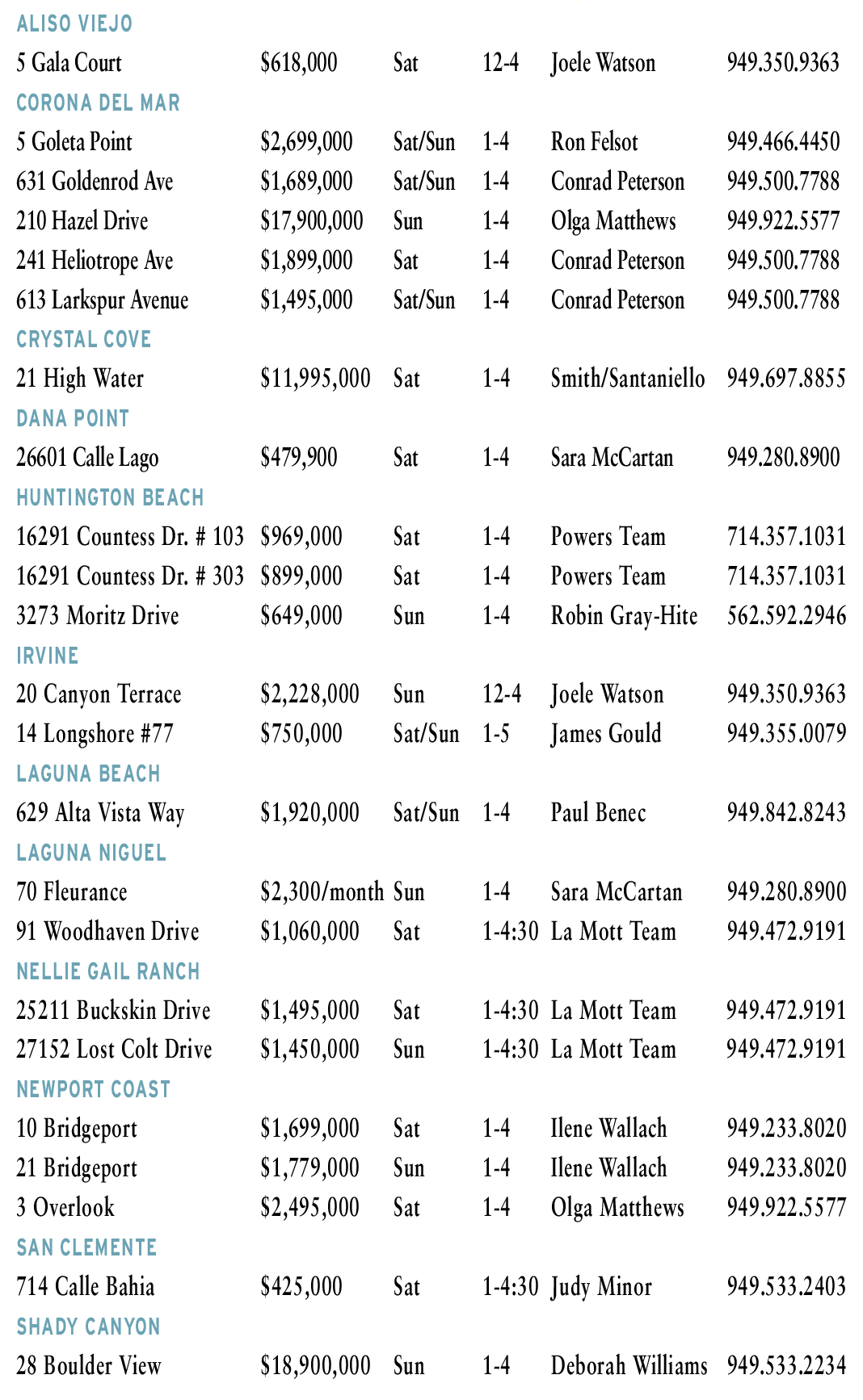 ALISO VIEJO 5 Gala Court $618,000 Sat 12-4 Joele Watson 949.350.9363 CORONA DEL MAR 5 Goleta Point $2,699,000 Sat/Sun 1-4 Ron Felsot 949.466.4450 631 Goldenrod Ave $1,689,000 Sat/Sun 1-4 Conrad Peterson 949.500.7788 210 Hazel Drive $17,900,000 Sun 1-4 Olga Matthews 949.922.5577 241 Heliotrope Ave $1,899,000 Sat 1-4 Conrad Peterson 949.500.7788 613 Larkspur Avenue $1,495,000 Sat/Sun 1-4 Conrad Peterson 949.500.7788 CRYSTAL COVE 21 High Water $11,995,000 Sat 1-4 Smith/Santaniello 949.697.8855 DANA POINT 26601 Calle Lago $479,900 Sat 1-4 Sara McCartan 949.280.8900 HUNTINGTON BEACH 16291 Countess Dr. # 103 $969,000 Sat 1-4 Powers Team 714.357.1031 16291 Countess Dr. # 303 $899,000 Sat 1-4 Powers Team 714.357.1031 3273 Moritz Drive $649,000 Sun 1-4 Robin Gray-Hite 562.592.2946 IRVINE 20 Canyon Terrace $2,228,000 Sun 12-4 Joele Watson 949.350.9363 14 Longshore #77 $750,000 Sat/Sun 1-5 James Gould 949.355.0079 LAGUNA BEACH 629 Alta Vista Way $1,920,000 Sat/Sun 1-4 Paul Benec 949.842.8243 LAGUNA NIGUEL 70 Fleurance $2,300/month Sun 1-4 Sara McCartan 949.280.8900 91 Woodhaven Drive $1,060,000 Sat 1-4:30 La Mott Team 949.472.9191 NELLIE GAIL RANCH 25211 Buckskin Drive $1,495,000 Sat 1-4:30 La Mott Team 949.472.9191 27152 Lost Colt Drive $1,450,000 Sun 1-4:30 La Mott Team 949.472.9191 NEWPORT COAST 10 Bridgeport $1,699,000 Sat 1-4 Ilene Wallach 949.233.8020 21 Bridgeport $1,779,000 Sun 1-4 Ilene Wallach 949.233.8020 3 Overlook $2,495,000 Sat 1-4 Olga Matthews 949.922.5577 SAN CLEMENTE 714 Calle Bahia $425,000 Sat 1-4:30 Judy Minor 949.533.2403 SHADY CANYON 28 Boulder View $18,900,000 Sun 1-4 Deborah Williams 949.533.2234