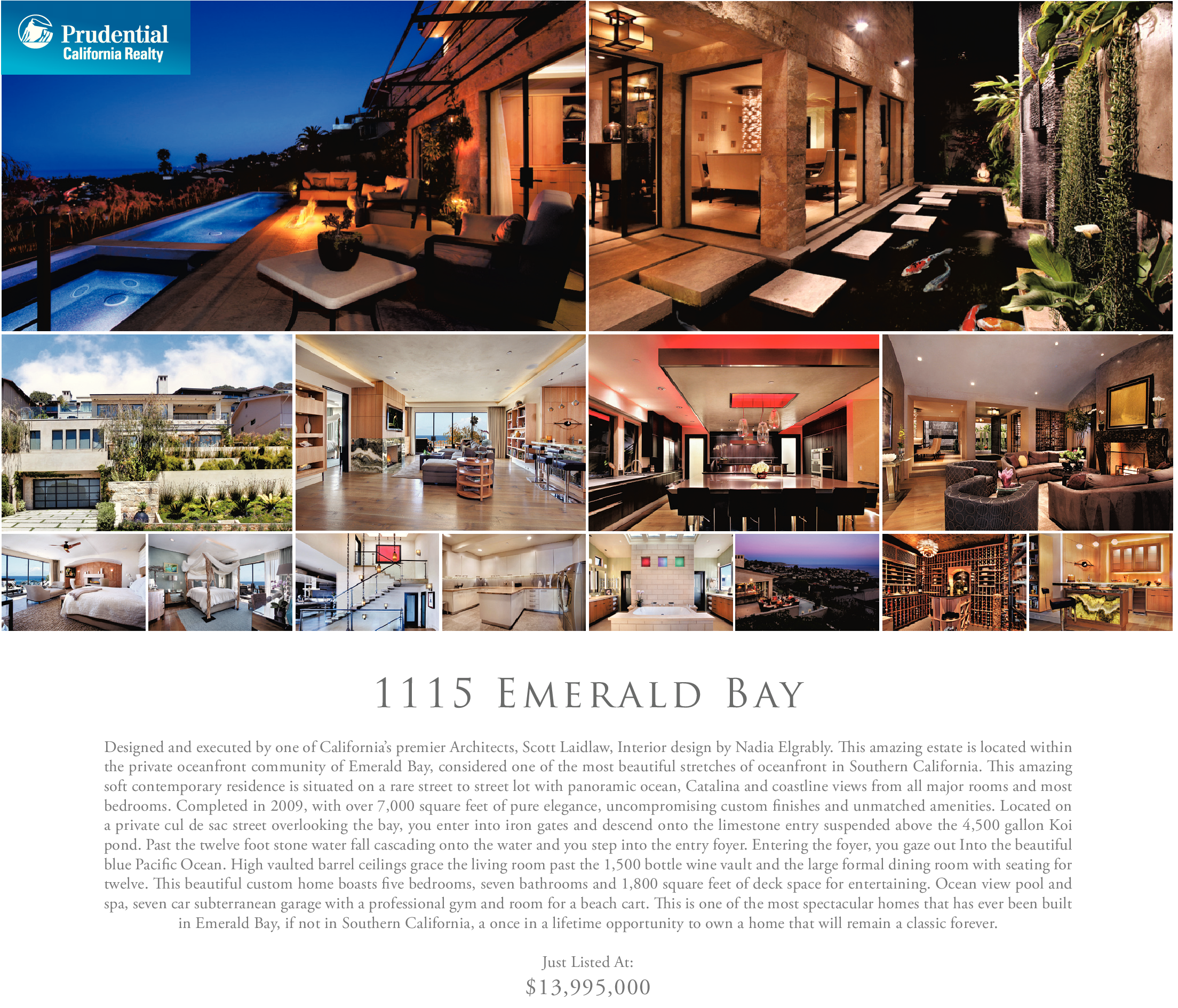 1 1 1 5 E m e r a l d B ay Designed and executed by one of California’s premier Architects, Scott Laidlaw, Interior design by Nadia Elgrably. This amazing estate is located within the private oceanfront community of Emerald Bay, considered one of the most beautiful stretches of oceanfront in Southern California. This amazing soft contemporary residence is situated on a rare street to street lot with panoramic ocean, Catalina and coastline views from all major rooms and most bedrooms. Completed in 2009, with over 7,000 square feet of pure elegance, uncompromising custom finishes and unmatched amenities. Located on a private cul de sac street overlooking the bay, you enter into iron gates and descend onto the limestone entry suspended above the 4,500 gallon Koi pond. Past the twelve foot stone water fall cascading onto the water and you step into the entry foyer. Entering the foyer, you gaze out Into the beautiful blue Pacific Ocean. High vaulted barrel ceilings grace the living room past the 1,500 bottle wine vault and the large formal dining room with seating for twelve. This beautiful custom home boasts five bedrooms, seven bathrooms and 1,800 square feet of deck space for entertaining. Ocean view pool and spa, seven car subterranean garage with a professional gym and room for a beach cart. This is one of the most spectacular homes that has ever been built in Emerald Bay, if not in Southern California, a once in a lifetime opportunity to own a home that will remain a classic forever. Just Listed At: $13,995,000