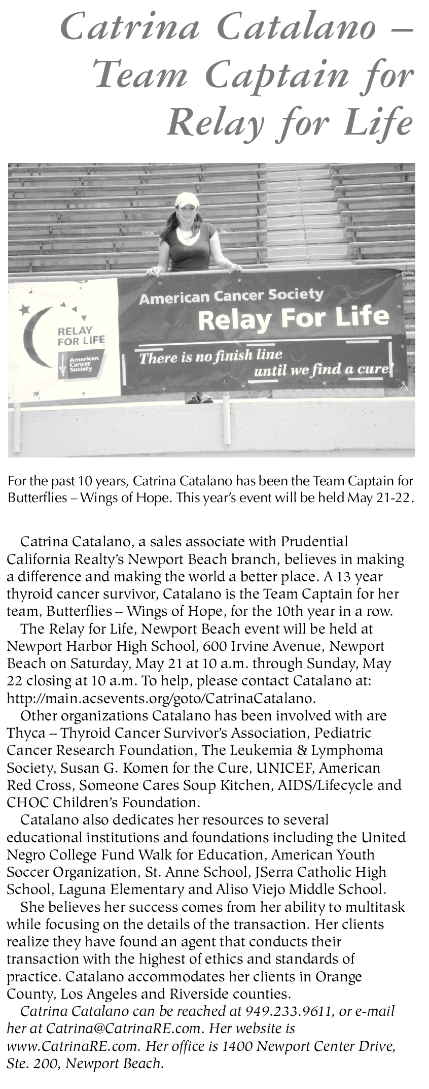 Catrina Catalano, a sales associate with Prudential California Realty’s Newport Beach branch, believes in making a difference and making the world a better place. A 13 year thyroid cancer survivor, Catalano is the Team Captain for her team, Butterflies – Wings of Hope, for the 10th year in a row.