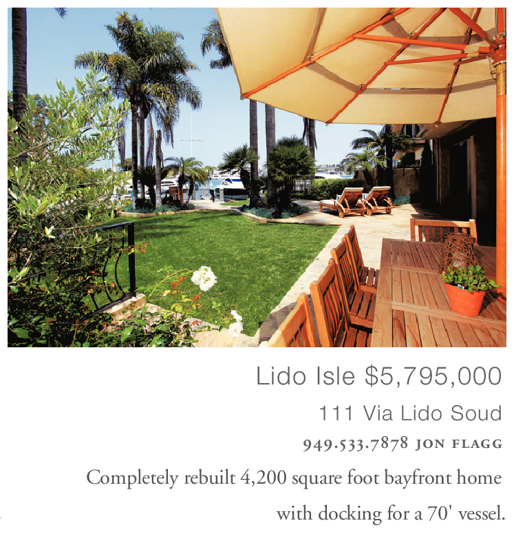 Lido Isle $5,795,000 111 Via Lido Soud 949.533.7878 jon flagg Completely rebuilt 4,200 square foot bayfront home with docking for a 70' vessel.