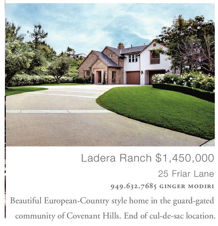 Ladera Ranch $1,450,000 25 Friar Lane 949.632.7685 ginger modiri Beautiful European-Country style home in the guard-gated community of Covenant Hills. End of cul-de-sac location.