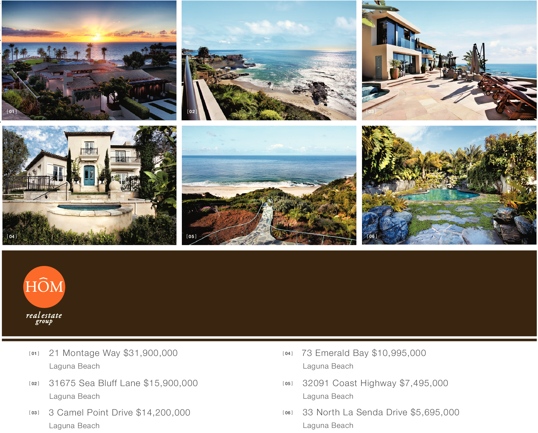 28 [ 01 ] [ 02 ] [ 03 ] [ 04 ] [ 05 ] [ 06 ] [ 01 ] [ 02 ] [ 03 ] 21 Montage Way $31,900,000 Laguna Beach 31675 Sea Bluff Lane $15,900,000 Laguna Beach 3 Camel Point Drive $14,200,000 Laguna Beach 73 Emerald Bay $10,995,000 Laguna Beach [ 04 ] [ 05 ] [ 06 ] 32091 Coast Highway $7,495,000 Laguna Beach 33 North La Senda Drive $5,695,000 Laguna Beach