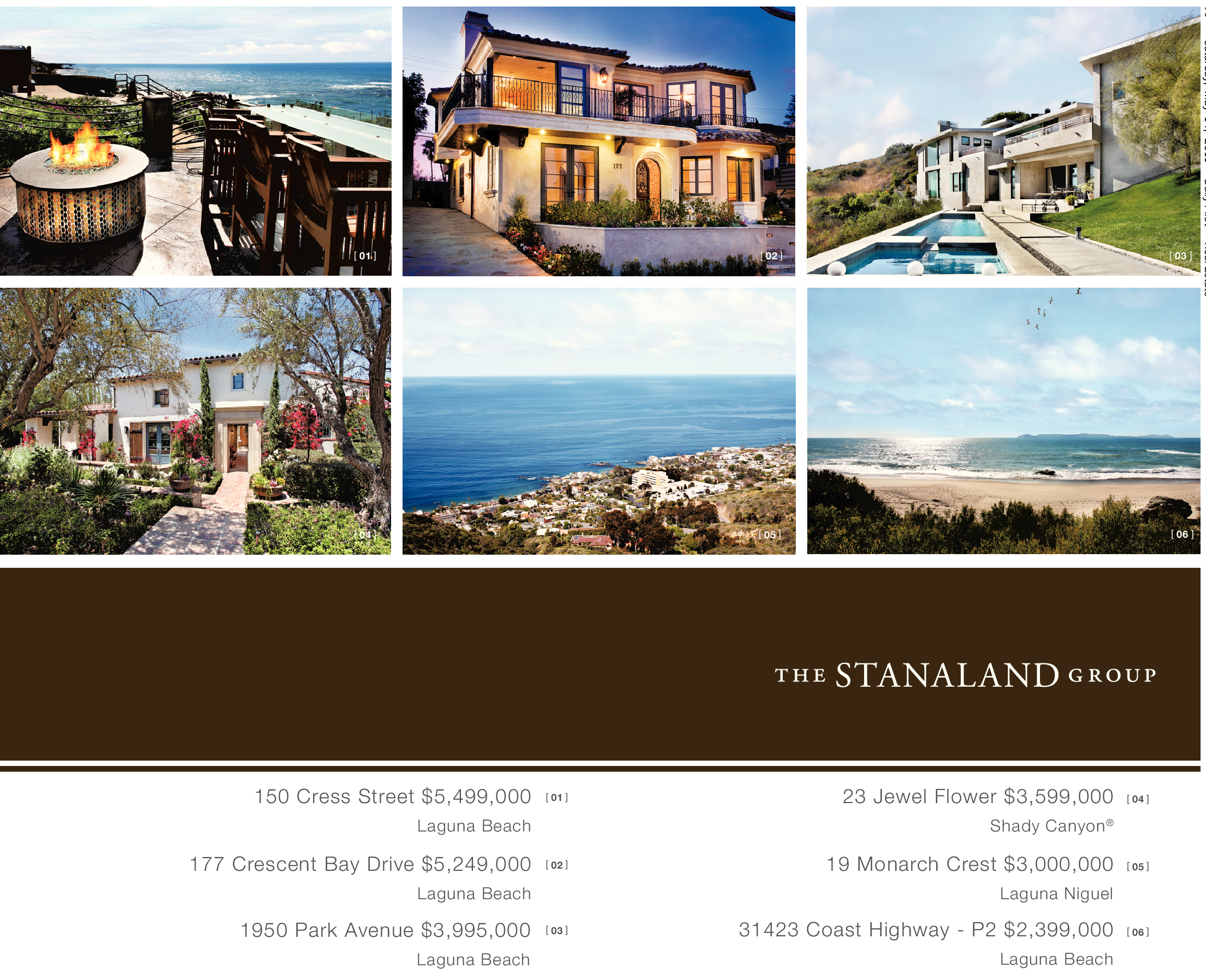 [ 01 ] [ 02 ] [ 04 ] [ 05 ] 150 Cress Street $5,499,000 Laguna Beach 177 Crescent Bay Drive $5,249,000 Laguna Beach 1950 Park Avenue $3,995,000 Laguna Beach [ 01 ] [ 02 ] [ 03 ] 23 Jewel Flower $3,599,000 Shady Canyon ® 19 Monarch Crest $3,000,000 Laguna Niguel 31423 Coast Highway - P2 $2,399,000 Laguna Beach [ 04 ] [ 05 ] [ 06 ] [ 03 ] [ 06 ] 29