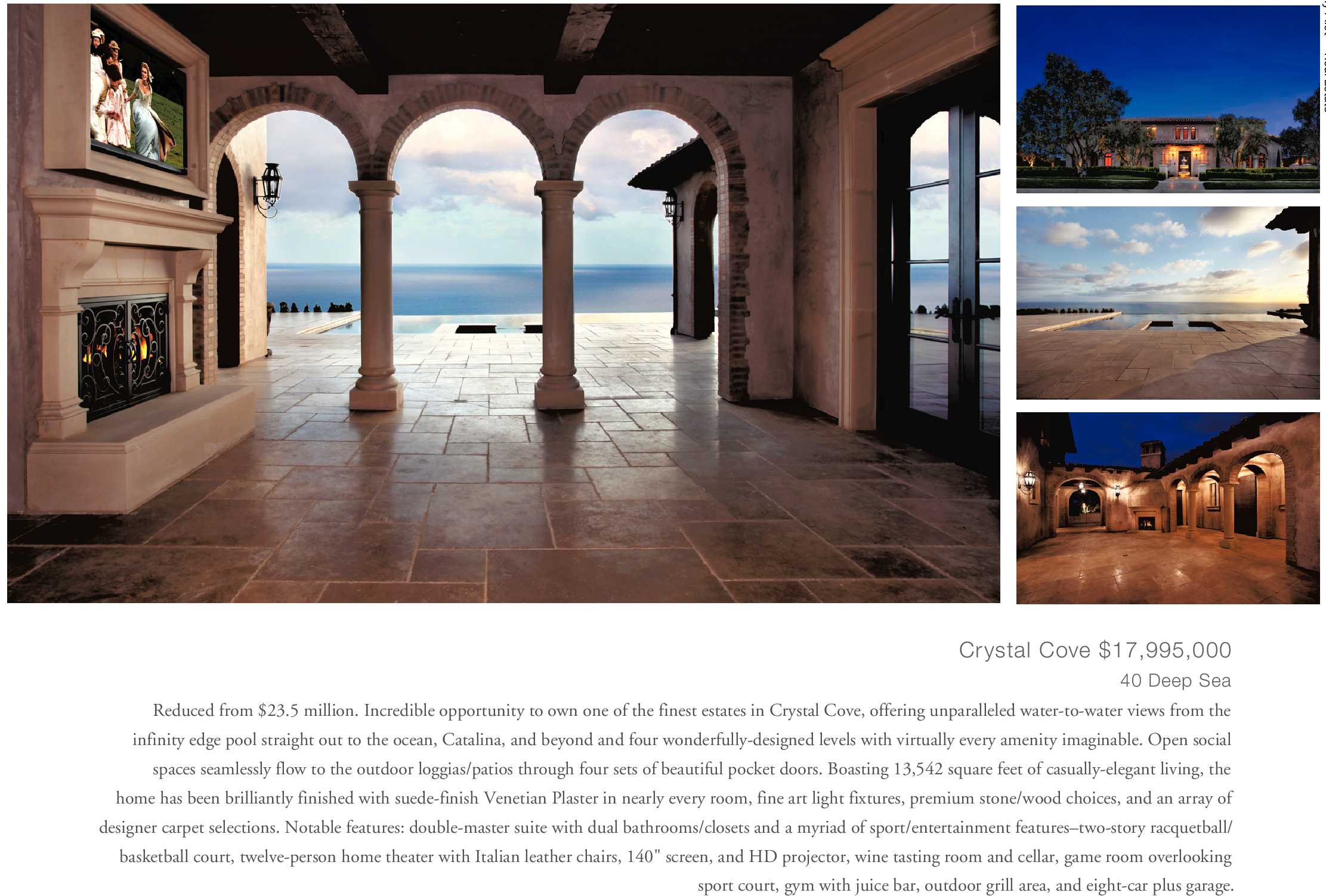 Crystal Cove $17,995,000 40 Deep Sea Reduced from $23.5 million. Incredible opportunity to own one of the finest estates in Crystal Cove, offering unparalleled water-to-water views from the infinity edge pool straight out to the ocean, Catalina, and beyond and four wonderfully-designed levels with virtually every amenity imaginable. Open social spaces seamlessly flow to the outdoor loggias/patios through four sets of beautiful pocket doors. Boasting 13,542 square feet of casually-elegant living, the home has been brilliantly finished with suede-finish Venetian Plaster in nearly every room, fine art light fixtures, premium stone/wood choices, and an array of designer carpet selections. Notable features: double-master suite with dual bathrooms/closets and a myriad of sport/entertainment features–two-story racquetball/ basketball court, twelve-person home theater with Italian leather chairs, 140" screen, and HD projector, wine tasting room and cellar, game room overlooking sport court, gym with juice bar, outdoor grill area, and eight-car plus garage.