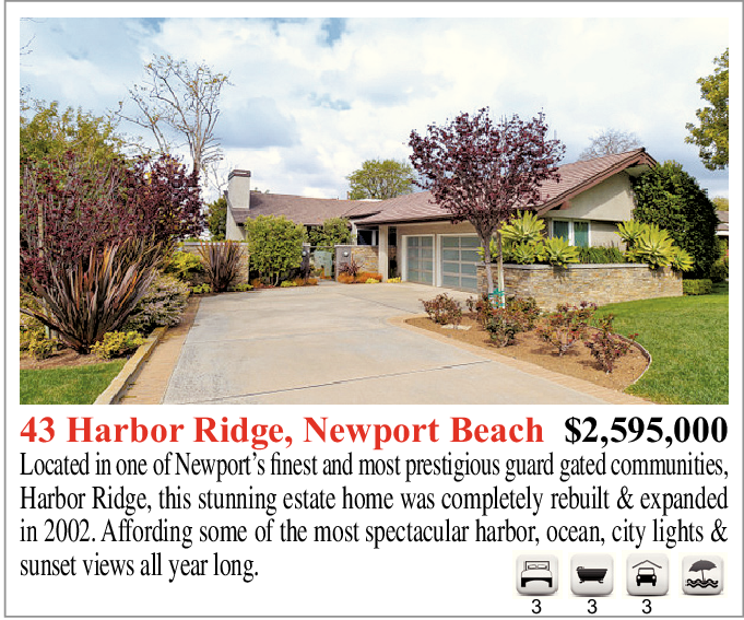 43 Harbor Ridge, Newport Beach $2,595,000 Located in one of Newport’s finest and most prestigious guard gated communities, Harbor Ridge, this stunning estate home was completely rebuilt & expanded in 2002. Affording some of the most spectacular harbor, ocean, city lights & sunset views all year long. 3 3 3