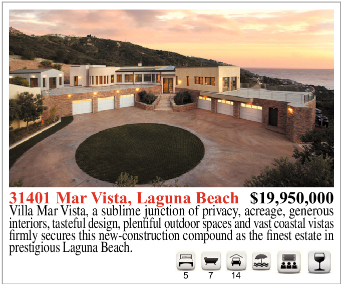 31401 Mar Vista, Laguna Beach $19,950,000 Villa Mar Vista, a sublime junction of privacy, acreage, generous interiors, tasteful design, plentiful outdoor spaces and vast coastal vistas firmly secures this new-construction compound as the finest estate in prestigious Laguna Beach. 5 7 14