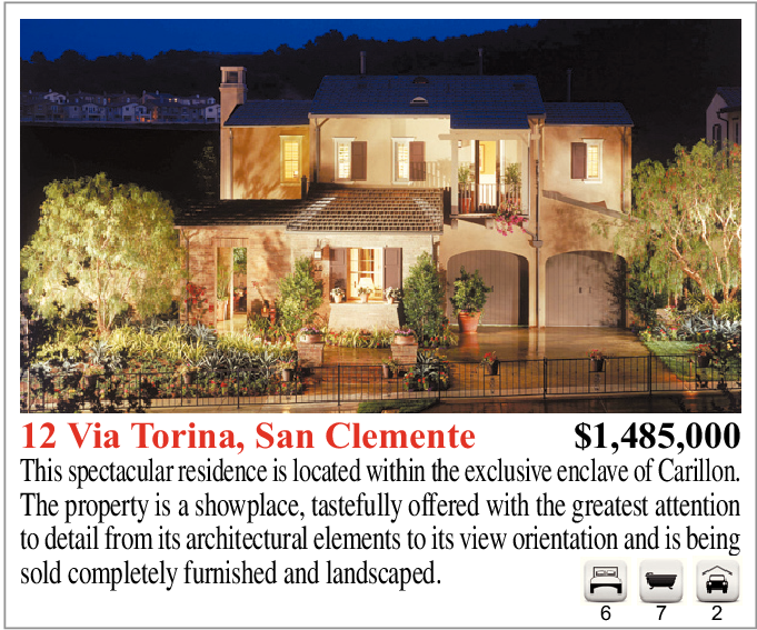 12 Via Torina, San Clemente $1,485,000 This spectacular residence is located within the exclusive enclave of Carillon. The property is a showplace, tastefully offered with the greatest attention to detail from its architectural elements to its view orientation and is being sold completely furnished and landscaped.