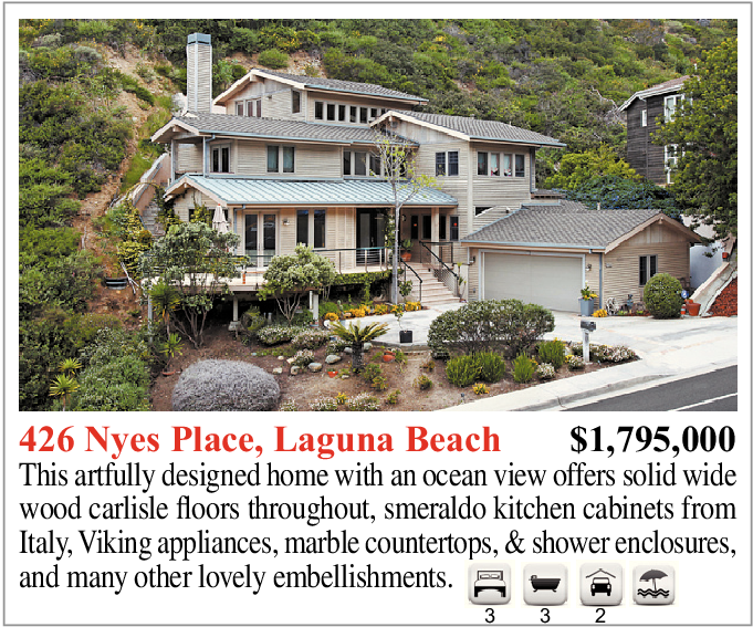 426 Nyes Place, Laguna Beach $1,795,000 This artfully designed home with an ocean view offers solid wide wood carlisle floors throughout, smeraldo kitchen cabinets from Italy, Viking appliances, marble countertops, & shower enclosures, and many other lovely embellishments. 3 3 2