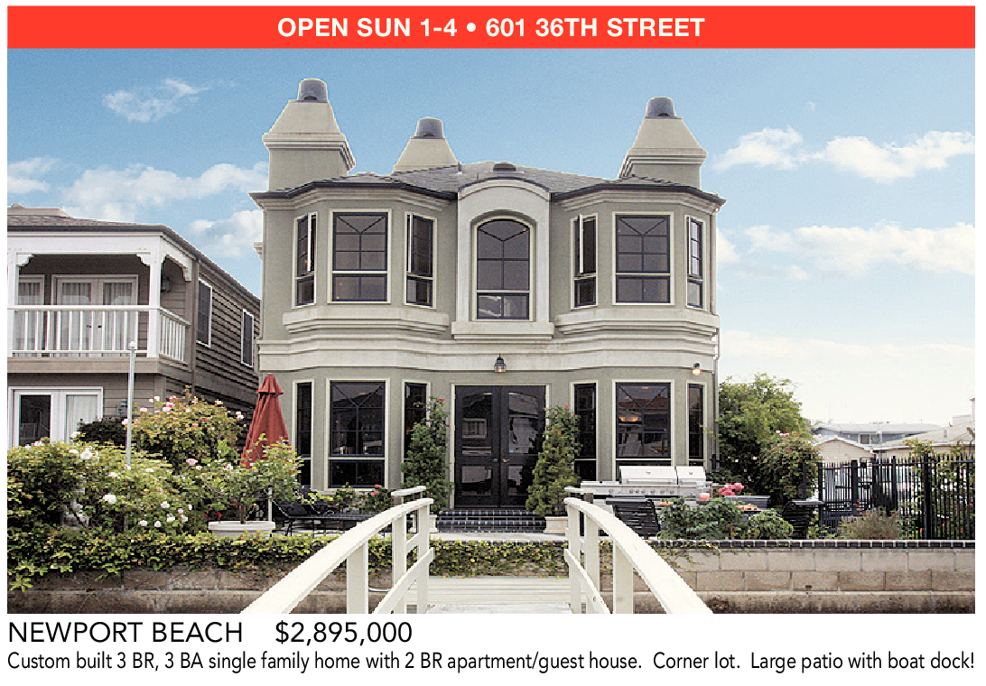 NEWPORT BEACH $2,895,000 Custom built 3 BR, 3 BA single family home with 2 BR apartment/guest house. Corner lot. Large patio with boat dock!