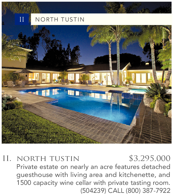 north tustin $3,295,000 Private estate on nearly an acre features detached guesthouse with living area and kitchenette, and 1500 capacity wine cellar with private tasting room.