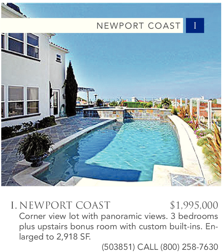 I. NEWPORT COAST $1,995,000 Corner view lot with panoramic views. 3 bedrooms plus upstairs bonus room with custom built-ins. Enlarged to 2,918 SF.