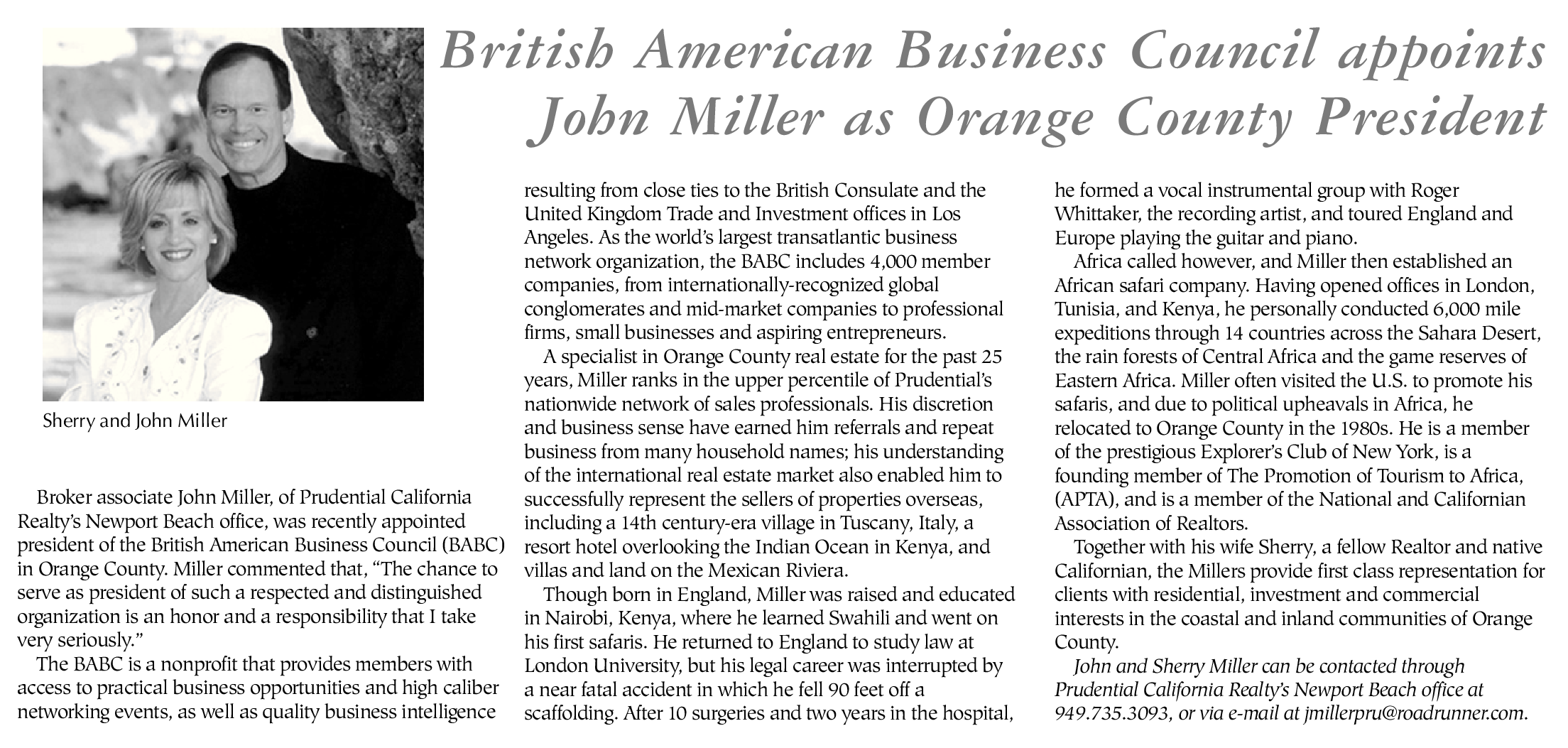 Broker associate John Miller, of Prudential California Realty’s Newport Beach office, was recently appointed president of the British American Business Council (BABC) in Orange County. Miller commented that, “The chance to serve as president of such a respected and distinguished organization is an honor and a responsibility that I take very seriously.”