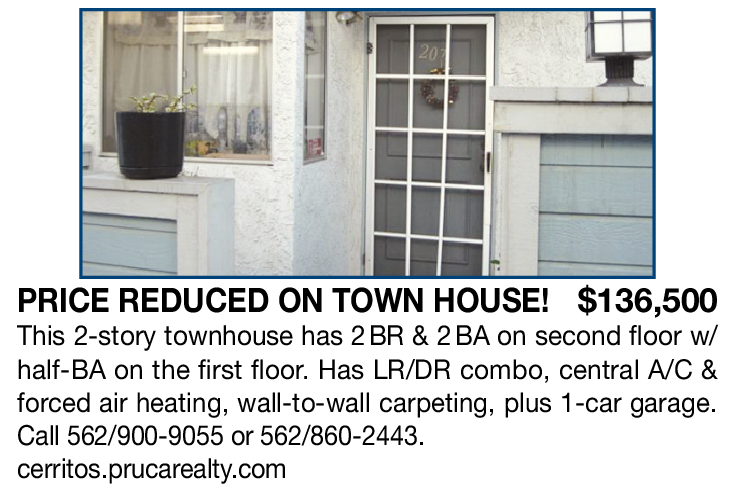 PRICE REDUCED ON TOWN HOUSE! $136,500 This 2-story townhouse has 2BR & 2 BA on second floor w/ half-BA on the first floor. Has LR/DR combo, central A/C & forced air heating, wall-to-wall carpeting, plus 1-car garage. Call 562/900-9055 or 562/860-2443. cerritos.prucarealty.com