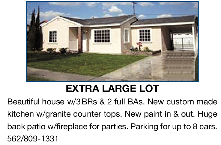 EXTRA LARGE LOT Beautiful house w/3 BRs & 2 full BAs. New custom made kitchen w/granite counter tops. New paint in & out. Huge back patio w/fireplace for parties. Parking for up to 8 cars. 562/809-1331