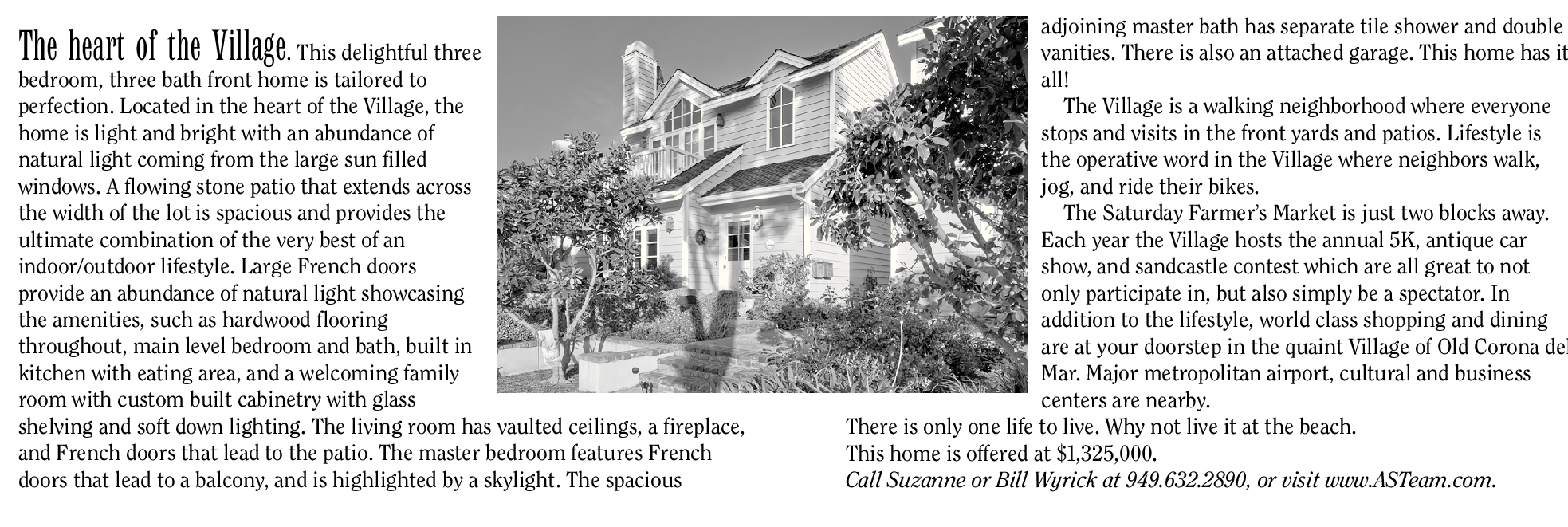 The heart of the Village. This delightful three bedroom, three bath front home is tailored to perfection. Located in the heart of the Village, the home is light and bright with an abundance of natural light coming from the large sun filled windows. A flowing stone patio that extends across the width of the lot is spacious and provides the ultimate combination of the very best of an indoor/outdoor lifestyle. Large French doors provide an abundance of natural light showcasing the amenities, such as hardwood flooring throughout, main level bedroom and bath, built in kitchen with eating area, and a welcoming family room with custom built cabinetry with glass shelving and soft down lighting. The living room has vaulted ceilings, a fireplace, and French doors that lead to the patio. The master bedroom features French doors that lead to a balcony, and is highlighted by a skylight. The spacious adjoining master bath has separate tile shower and double vanities. There is also an attached garage. This home has it all! The Village is a walking neighborhood where everyone stops and visits in the front yards and patios. Lifestyle is the operative word in the Village where neighbors walk, jog, and ride their bikes. The Saturday Farmer’s Market is just two blocks away. Each year the Village hosts the annual 5K, antique car show, and sandcastle contest which are all great to not only participate in, but also simply be a spectator. In addition to the lifestyle, world class shopping and dining are at your doorstep in the quaint Village of Old Corona del Mar. Major metropolitan airport, cultural and business centers are nearby. There is only one life to live. Why not live it at the beach. This home is offered at $1,325,000. Call Suzanne or Bill Wyrick at 949.632.2890, or visit www.ASTeam.com.