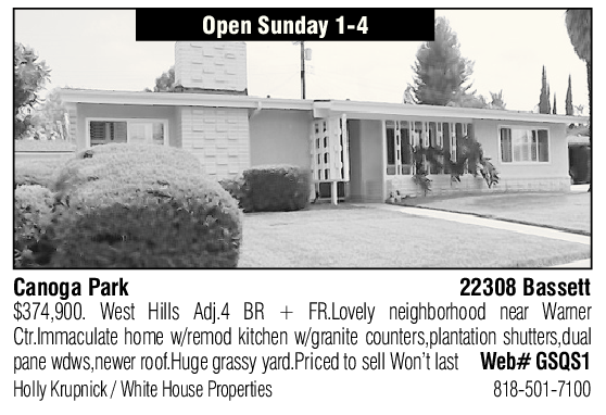 Open Sunday 1-4 Canoga Park 22308 Bassett $374,900. West Hills Adj.4 BR + FR.Lovely neighborhood near Warner Ctr.Immaculate home w/remod kitchen w/granite counters,plantation shutters,dual pane wdws,newer roof.Huge grassy yard.Priced to sell Won’t last Web# GSQS1 Holly Krupnick / White House Properties 818-501-7100 See also