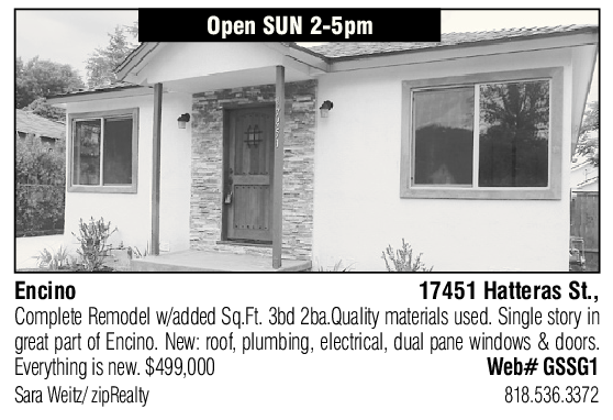 Open SUN 2-5pm Encino 17451 Hatteras St., Complete Remodel w/added Sq.Ft. 3bd 2ba.Quality materials used. Single story in great part of Encino. New: roof, plumbing, electrical, dual pane windows & doors. Everything is new. $499,000 Web# GSSG1 Sara Weitz/ zipRealty 818.536.3372