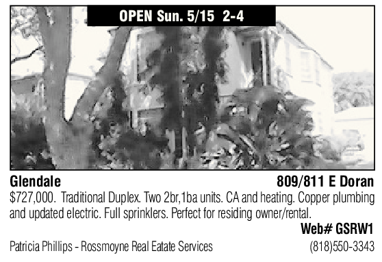 OPEN Sun. 5/15 2-4 Glendale 809/811 E Doran $727,000. Traditional Duplex. Two 2br,1ba units. CA and heating. Copper plumbing and updated electric. Full sprinklers. Perfect for residing owner/rental. Web# GSRW1 Patricia Phillips - Rossmoyne Real Eatate Services (818)550-3343