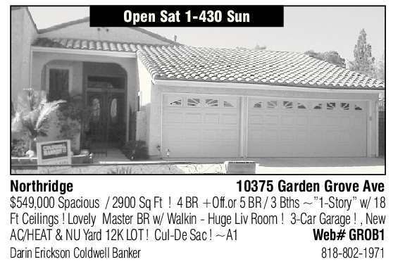 Open Sat 1-430 Sun Northridge 10375 Garden Grove Ave $549,000 Spacious / 2900 Sq Ft ! 4 BR +Off.or 5 BR / 3 Bths ~”1-Story” w/ 18 Ft Ceilings ! Lovely Master BR w/ Walkin - Huge Liv Room ! 3-Car Garage!,New AC/HEAT & NU Yard 12K LOT ! Cul-De Sac ! ~A1 Web# GROB1 Darin Erickson Coldwell Banker 818-802-1971