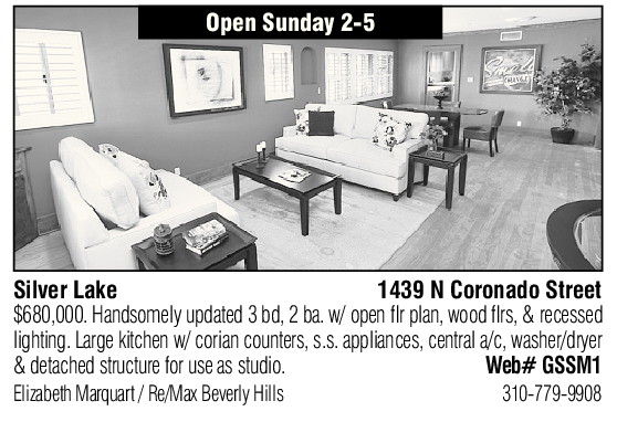 Open Sunday 2-5 Silver Lake 1439 N Coronado Street $680,000. Handsomely updated 3 bd, 2 ba. w/ open flr plan, wood flrs, & recessed lighting. Large kitchen w/ corian counters, s.s. appliances, central a/c, washer/dryer & detached structure for use as studio. Web# GSSM1 Elizabeth Marquart / Re/Max Beverly Hills 310-779-9908 See also