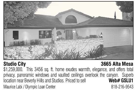 Studio City 3665 Alta Mesa $1,259,000. This 3456 sq. ft. home exudes warmth, elegance, and offers total privacy. panoramic windows and vaulted ceilings overlook the canyon. Superb location near Beverly Hills and Studios. Priced to sell Web# GSLU1 Maurice Labi / Olympic Loan Center 818-216-9543