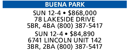 BUENA PARK SUN 12-4 • $868,000 78 LAKESIDE DRIVE 5BR, 4BA (800) 387-5417 SUN 12-4 • $84,890 6741 LINCOLN UNIT 142 3BR, 2BA (800) 387-5417