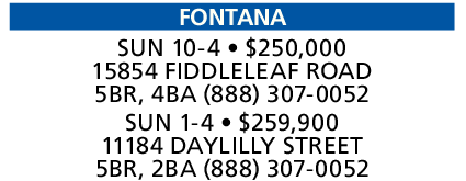 FONTANA SUN 10-4 • $250,000 15854 FIDDLELEAF ROAD 5BR, 4BA (888) 307-0052 SUN 1-4 • $259,900 11184 DAYLILLY STREET 5BR, 2BA (888) 307-0052