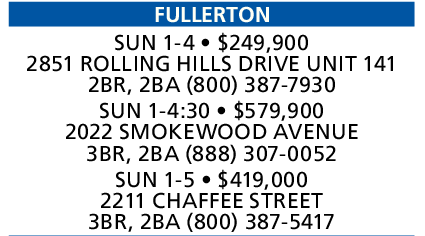 FULLERTON SUN 1-4 • $249,900 2851 ROLLING HILLS DRIVE UNIT 141 2BR, 2BA (800) 387-7930 SUN 1-4:30 • $579,900 2022 SMOKEWOOD AVENUE 3BR, 2BA (888) 307-0052 SUN 1-5 • $419,000 2211 CHAFFEE STREET 3BR, 2BA (800) 387-5417