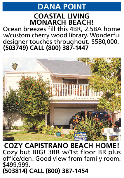 DANA POINT COASTAL LIVING MONARCH BEACH! Ocean breezes fill this 4BR, 2.5BA home w/custom cherry wood library. Wonderful designer touches throughout. $580,000. (503749) CALL (800) 387-1447 COZY CAPISTRANO BEACH HOME! Cozy but BIG! 3BR w/1st floor BR plus office/den. Good view from family room. $499,999. (503814) CALL (800) 387-1454