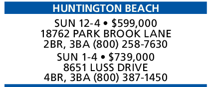 HUNTINGTON BEACH SUN 12-4 • $599,000 18762 PARK BROOK LANE 2BR, 3BA (800) 258-7630 SUN 1-4 • $739,000 8651 LUSS DRIVE 4BR, 3BA (800) 387-1450 IRVINE