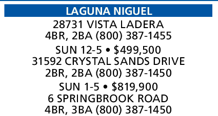 LAGUNA NIGUEL 28731 VISTA LADERA 4BR, 2BA (800) 387-1455 SUN 12-5 • $499,500 31592 CRYSTAL SANDS DRIVE 2BR, 2BA (800) 387-1450 SUN 1-5 • $819,900 6 SPRINGBROOK ROAD 4BR, 3BA (800) 387-1450