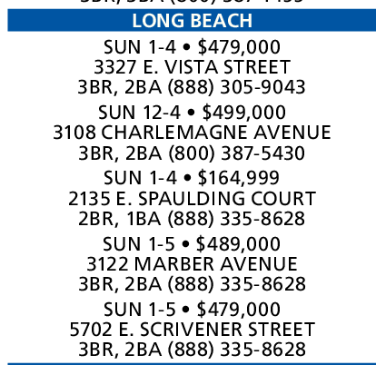 3BR, 3BA (800) 387-1455 LONG BEACH SUN 1-4 • $479,000 3327 E. VISTA STREET 3BR, 2BA (888) 305-9043 SUN 12-4 • $499,000 3108 CHARLEMAGNE AVENUE 3BR, 2BA (800) 387-5430 SUN 1-4 • $164,999 2135 E. SPAULDING COURT 2BR, 1BA (888) 335-8628 SUN 1-5 • $489,000 3122 MARBER AVENUE 3BR, 2BA (888) 335-8628 SUN 1-5 • $479,000 5702 E. SCRIVENER STREET 3BR, 2BA (888) 335-8628 LOS ANGELES