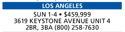 3BR, 2BA (888) 335-8628 LOS ANGELES SUN 1-4 • $459,999 3619 KEYSTONE AVENUE UNIT 4 2BR, 3BA (800) 258-7630