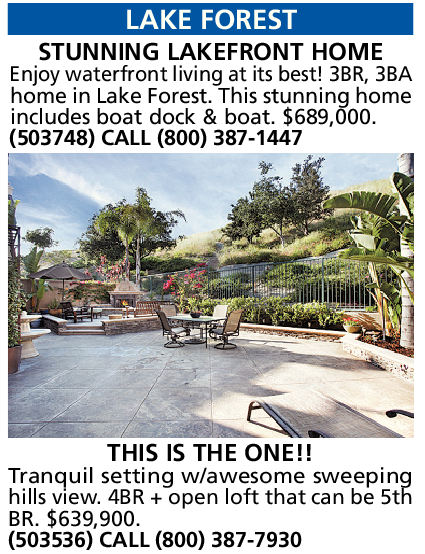 LAKE FOREST STUNNING LAKEFRONT HOME Enjoy waterfront living at its best! 3BR, 3BA home in Lake Forest. This stunning home includes boat dock & boat. $689,000.