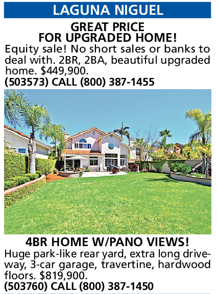 LAGUNA NIGUEL GREAT PRICE FOR UPGRADED HOME! Equity sale! No short sales or banks to deal with. 2BR, 2BA, beautiful upgraded home. $449,900. (503573) CALL (800) 387-1455 4BR HOME W/PANO VIEWS! Huge park-like rear yard, extra long driveway, 3-car garage, travertine, hardwood floors. $819,900. (503760) CALL (800) 387-1450