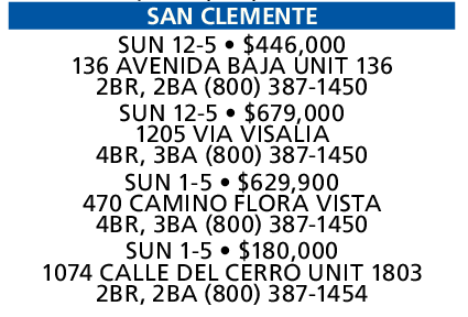 SAN CLEMENTE SUN 12-5 • $446,000 136 AVENIDA BAJA UNIT 136 2BR, 2BA (800) 387-1450 SUN 12-5 • $679,000 1205 VIA VISALIA 4BR, 3BA (800) 387-1450 SUN 1-5 • $629,900 470 CAMINO FLORA VISTA 4BR, 3BA (800) 387-1450 SUN 1-5 • $180,000 1074 CALLE DEL CERRO UNIT 1803 2BR, 2BA (800) 387-1454