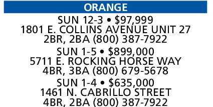 ORANGE SUN 12-3 • $97,999 1801 E. COLLINS AVENUE UNIT 27 2BR, 2BA (800) 387-7922 SUN 1-5 • $899,000 5711 E. ROCKING HORSE WAY 4BR, 3BA (800) 679-5678 SUN 1-4 • $635,000 1461 N. CABRILLO STREET 4BR, 2BA (800) 387-7922